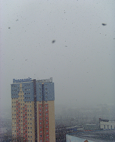 Une multitude de flocons s'agitent, tourbillonnent, se laissent porter par les courants d'air, teintent de blanc, de gris, l'horizon. Paysage de coton au loin, ciel bas qui s'insinue entre les immeubles, agitation moléculaire de l'ensemble, de par leur densité l'atmosphère semble presque épaisse, impénétrable.