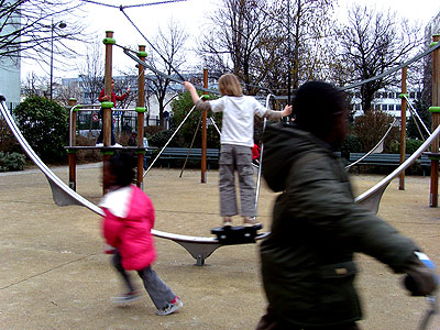 Je retrouve ma troupe un peu plus haut, ma fille suspendue, les jambes en l'air sur la tyrolienne, je ravale mes craintes de père, "elle s'amuse", juste le temps de m'asseoir et mon fils se "mange" un gamin qui passe au moment où il s'élance. Souffle coupé, pleurs, je propose de rentrer. Devant les réticences, en bon diplomate, j'offre une crêpe au Nutella et un paquet de cacahuètes grillées. On rentre à la maison, copains comme cochons!