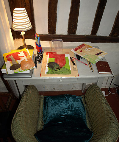 Entre ces labours graphiques à Paris et cette petite table de travail normande, à Bourville, des routes rectilignes bordées de champs de colza, de betteraves, les flêches d'une cathédrale perdues dans le brouillard, les essuies glace qui balayent une fine pluie constante, un ciel bas et gris. Et puis l'air soudain iodée, des maisons qui s'habillent de colombages, des prairies très vertes, des vaches et des chevaux qui ne se soucient pas du vent, de la pluie et de la fraicheur. Un feu de cheminée, prendre ces marques dans une autre maison, pendre nos vêtements dans d'autres armoires... Loin de la ville, entendre les cloches marquées les heures, le vent dans les arbres, la pluie contre le carreau, une autre idée du confort.
