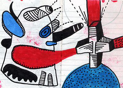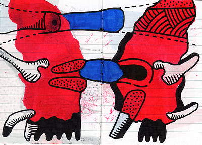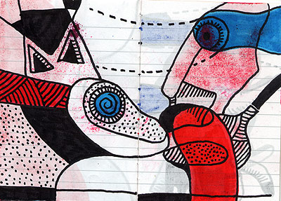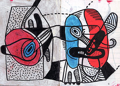 Je débute un nouveau carnet (7 X 10cm) où je me laisse diavaguer entre rouge et bleu...