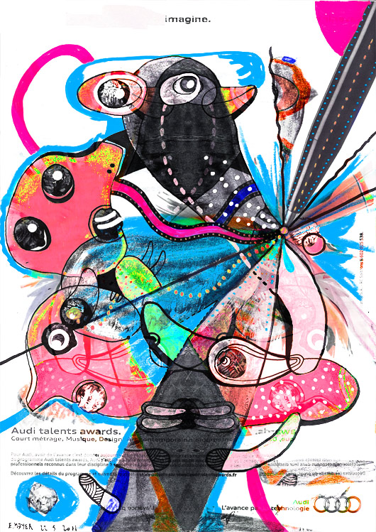 Explosion graphique, en couleur, au bout du stylo et au dos de "A nous Paris" sur la belle page presque blanche offerte par Les Audi Talents Awards...