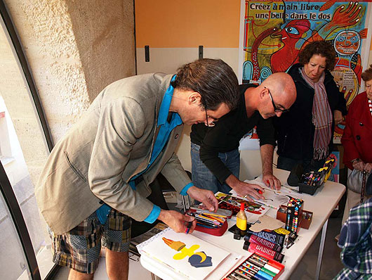C'est dans le très bel Espace des Blancs Manteaux - 75004 Paris et sous un soleil radieux que la revue KUU tenait salon (organisé par la sympathique et très efficace équipe de l'association Ent'revues) les 15 et 16 octobre dernier en compagnie d'un grand nombre de ses semblables. Une foule d'éditeurs et de passionnés d'édition se pressaient devant et derrière chaque stand en quête de nouveautés et de découvertes. Ce fut l'occasion pour Ivan Sigg et moi-même de rencontrer nos lecteurs, de présenter le dernier numéro de la revue KUU fraîchement paru et de prendre le temps d'expliquer notre démarche éditoriale, nos pratiques collectives et le fonctionnement de ce laboratoire d'échanges artistiques, littéraires et poétiques. De belles rencontres ponctuèrent ces deux jours et ce fut un plaisir de dialoguer, de répondre aux nombreuses questions et de satisfaire la curiosité des visiteurs. Le stand présentait également quelques unes de nos dernières peintures sur toile et envois postaux et nous n'avons pas hésité à faire exploser la couleur en réalisant quelques quatrièmes de couverture en public à l'occasion d'une conférence donnée le samedi après-midi sur le thème "KUU, un creuset de créativité en partage". Merci à ceux qui sont venus nous renouveler leur confiance et à tous ceux, nombreux, qui ont montré de l'intérêt pour notre aventure et on choisit de l'accompagner en devenant lecteur, diffuseur et prescripteur de cette revue d'art expérimentale qu'est KUU.