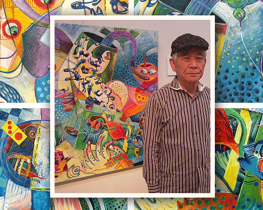 Kenji Horiuchi organisateur du NingenTen en soutien aux sinistrés de la région de Sendaï devant "A petit feu au bord de l'eau" oeuvre KUU-lective
