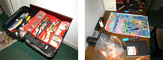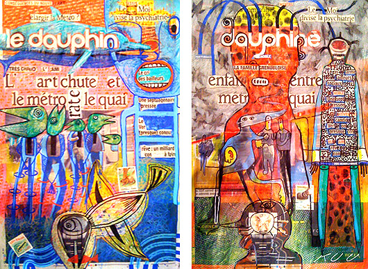 De retour à l'hôtel et après un excellent repas nous rejoignons notre chambre qui se transforme rapidement en atelier de fortune. Nous métamorphosons à coups de Poscas, de pinceaux et de pastels deux Unes du Dauphiné Libéré acheté au siège du journal à notre arrivée et que nous avons l'intention de présenter aux élèves le lendemain. KUU parle au quotidien.