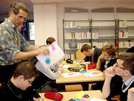 Daniel, documentaliste du lycée, nous ouvre les portes du CDI et nous installons la salle, notre matériel et présentons nos publications. Les élèves arrivent et prennent place pour deux heures d'atelier / conférence. Nous parlons de nos parcours, de l'aventure éditoriale de la revue, de pratiques collectives et présentons nos blogs et sites et montrons comment nous tissons des liens entre le numérique et le papier, entre le pinceau digital et le tube de pâte de couleur.